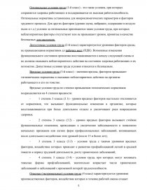Оптимальные условия труда (1-й класс) - это такие условия, при которых сохраняется здоровье работающих и поддерживается их высокая работоспособность. Оптимальные нормативы установлены для микроклиматических параметров и факторов трудового процесса. Для других факторов (уровни шума, вибрации, содержание в воздухе пыли и т.д.) условно за оптимальные принимаются такие условия труда, при которых неблагоприятные факторы отсутствуют или не превышают уровни, принятые в качестве безопасных для населения.