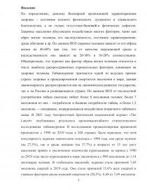 По определению, данному Всемирной организацией здравоохранения здоровье - состояние полного физического, душевного и социального благополучия, а не только отсутствие болезней и физических дефектов. Здоровье населения обусловлено воздействием многих факторов, таких как образ жизни человека, его наследственность, состояние здравоохранения, среда обитания и др. По данным ВОЗ здоровье человека зависит от его образа жизни на 40-60% при том, что от качества окружающей среды и наследственности оно зависит на 20-30% и 10-20% соответственно. Общепризнано, что курение как фактор образа жизни человека относится к числу наиболее распространенных отрицательных факторов, влияющих на здоровье человека. Табакокурение признается одной из ведущих причин утраты здоровья и преждевременной смертности населения в мире, данная закономерность распространяется как на экономически развитые государства, так и на Россию и развивающиеся страны. По данным ВОЗ от последствий употребления табака ежегодно гибнет более 8 миллионов человек. Более 7 миллионов из них – потребители и бывшие потребители табака, и более 1,2 миллиона — некурящие, подвергающиеся воздействию вторичного табачного дыма. В 2021 году Авторитетный британский медицинский журнал «The Lancet» опубликовал результаты крупномасштабного статистического исследования табакокурения. В исследовании проанализирован временной промежуток с 1990 по 2019 годы в 204 странах. Было выяснено, что хотя популярность курения значительно снизилась с 1990 года, как среди мужчин (на 27,5%), так и среди женщин (на 37,7%) в возрасте от 15 лет, рост населения привёл к увеличению количества курильщиков: за период с 1990 до 2019 года число курильщиков в мире увеличилось с 990 миллионов до 1,14 миллиарда человек. В глобальном масштабе, курение стало причиной 7,69 миллиона смертей в 2019 году. Оно стало причиной 13,6% всех смертей и главным фактором риска мужской смертности (20,2%). 6,68 из 7,69 миллиона