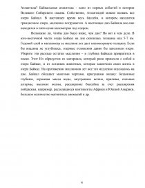 Среди внутренних водоемов Сибири – один особенно примечательный, уникальный и единственный в мире. Это озеро Байкал, настоящая жемчужина природы Сибири. Он расположен на высоте 456 метров и окружен горами. Это самое глубокое озеро в мире. Она впадает в 336 рек и вытекает из одной-Ангары. Озеро настолько уникально, что в 1969 году был даже создан Байкальский заповедник для сохранения и охраны этого удивительного участка природы Сибири. Возможно, нет ничего удивительного в том, что вы оказались на дне бывшего моря, воды которого отступили миллионы лет назад. Гораздо труднее представить себя на дне будущего океана. Он берет на себя впадины, встроенные в горные системы. На юге, в Саянах, – Тункинская, на северо-востоке – Нижне-Ангарская, Шуйская, Чарская. И везде-озера. Цепь озер опоясывает Азиатский континент. Его общая протяженность с юго-запада на северо-восток составляет более двух тысяч километров. Глубокие трещины в земной коре ломаются здесь, как корка буханки хлеба. Примерно посередине – гигантская впадина озера Байкал. 25-30 миллионов лет назад произошел разрыв земной коры. И с тех пор она неуклонно расширялась и углублялась, ускоряясь и замедляясь. Сибирская и Забайкальская тектонические плиты постепенно отдаляются друг от друга. Медленно расходясь, эти два гигантских "куска" земной коры освобождают место для океанического бассейна. Плиты раздвигаются в среднем на 2-3 мм в год. По-видимому, это ничтожная сумма. Но умножьте его, скажем, на 300 миллионов лет, и вы получите 600 километров. Это и есть океан. Иногда этот процесс ускоряется в пять, а то и в десять раз. Землетрясения - это сигналы о приближении "океанского времени". Конечно, в нашем человеческом масштабе она приближается очень, очень медленно и совершенно незаметно. Но в геологическом смысле времени, где счет идет на миллиарды, все происходит очень быстро. В истории Байкала была своя Атлантида. Это случилось 132 года назад. На глазах бурятских кочевников северная часть дельты реки Селенги, крупнейшей реки, впадающей в Байкал с Востока, была затоплена в новом 1862 году. Это была гигантская степь площадью около 200 〖км^2. Пять бурятских деревень и сотни голов скота ушли под воду. Почему не Атлантида? Байкальская атлантида - одно из первых событий в истории Великого Сибирского океана. Собственно, Атлантидой можно назвать все озеро Байкал. В настоящее время весь бассейн, в котором находится грандиозное озеро, медленно погружается. А настоящее дно Байкала все еще находится в пяти-семи километрах под озером.