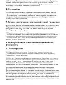 1.5. Программа предоставляет функциональную возможность использовать базу данных, являющуюся совокупностью пользователей (со скрытыми личными данными) мессенджера Telegram, с целью анонимного, или условно анонимного общения друг с другом, а также возможностью осуществлять поиск среди таких пользователей по заданным параметрам, доступных при помощи Программы (далее — «Ограниченный функционал») на возмездной основе в порядке, предусмотренном п.4 настоящей Лицензии. Функциональные возможности Программы могут быть ограничены в зависимости от устройства Пользователя.
