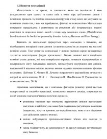 Менталізація – це процес, за допомогою якого ми імпліцитно й явно усвідомлюємо один одного та самих себе з точки зору суб’єктивних станів і психічних процесів. Це глибоко соціальна конструкція в тому сенсі, що ми уважні до психічних станів тих, з ким ми перебуваємо, фізично чи психологічно. Менталізація переважно передсвідома і спрямована на розуміння або інтерпретацію власної поведінки та поведінки інших людей з точки зору психічних станів. (Mentalization based treatment for borderline personality disorder Anthony Bateman and Peter Fonagy)