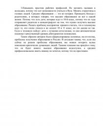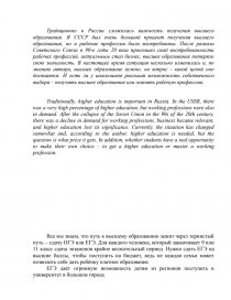 Traditionally, higher education is important in Russia. In the USSR, there was a very high percentage of higher education, but working professions were also in demand. After the collapse of the Soviet Union in the 90s of the 20th century, there was a decline in demand for working professions, business became relevant, and higher education lost its significance. Currently, the situation has changed somewhat and, according to the author, higher education is needed, but the question is what price it gets. In addition, whether students have a real opportunity to make their own choice – to get a higher education or master a working profession.