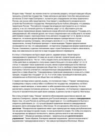 Вторую главу “Наказа”, мы можем отнести к условному разделу, который освещает общие принципы устройства государства. Глава написана в деловом стиле без эмоциональных всплесков. В этой главе Екатерина II, пытается дать определение системы правления в России, как она ее себе представляла. Она говорит о неизбежности монархического устройства Российского государства. Императрица была глубоко убеждена, что размеры территории России: “Российского государства владения простираются на 32 степени широты, и на 165 степеней долготы по земному шару” (ст.8); обусловили для нее единственно приемлемую форму правления в виде абсолютной монархии “Государь есть самодержавный, ибо никакая другая, как только соединенная в его особе власть не может действовали сходно с пространством столь великого государства” (ст.9). Далее в статьях говорится, что всякое другая форма правления вредна и разорительна и лучше повиноваться одному господину, чем угождать многим (ст.11,12). Можно только предполагать, почему Екатерина приходит к таким выводам. Первое предположение основывается на том, что самодержавие – исторически оправданная форма правления для России. А возможно, в данных положениях скрыт страх Екатерины потерять свою власть, ведь она сама взошла на престол в ходе государственного переворота.