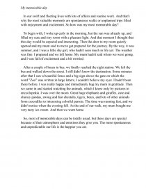 After a couple of hours in bus, we finally reached the right station. We left the bus and walked down the street. I still didn't know the destination. Some minutes after that I saw a beautiful fence and a big sign above the gate on which the word "Zoo" was written in large letters, I couldn't believe my eyes. I hadn't been there before. I was really happy and immediately hug my mum in gratitude. Then we came in and started watching the animals, which I knew only by pictures in encyclopedia. I was over the moon. Great huge elephants and giraffes, cute and clumsy pandas, strong and fast cheetahs, tigers, bears, and lots of other animals from crocodiles to interesting colorful parrots. The time was running fast, and we didn't notice when the evening fell. As the end of our walk, my mum bought me very tasty ice cream. And then we went home.