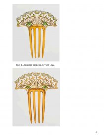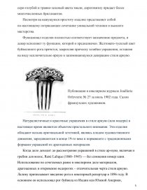 Предмет bijoux de créateurs, с утилитарным назначением по типу рогового гребня - для использования в женских прическах. Ювелирное изделие, исполнено в ярко выраженной стилистике арнуво, что видно из формы предмета и очертаний линий декора. Предмет представляет из себя трапециевидную форму со значительным расширением в верхней декорированной части. Основной материал – рог буйвола, имеющий некоторую небольшую прозрачность светло-оранжевого цвета. Нижняя часть представлена четырьмя зубцами характерной для гребня формой. Зубцы, в средней части предмета соединяются полуовальным завершением, формирующим гребень, от которого начинается декорирование с симметричным расширением в стороны. Металл, золото или возможно голдфилд, охватывает гребень, начиная с верхней трети массы гребня, и фиксируется одним гвоздиком. Декор выполнен в форме сектора окружности в верхней част и в виде ломанной линии направленной вдоль хорды окружности – в нижней части. Основной материал декора двуцветная эмаль. Самая яркая часть декорирования представлена трехлепестковыми цветами, напоминающие соцветия незабудки или ландышей, в количестве семи штук, расположенных симметрично, выполнены молочно-прозрачной эмалью нежно-голубого цвета, на плавно изгибающихся цветоножках от центра композиции. На двух стеблях, расходящиеся от боковой основы тела гребня, с динамичным тройным изгибом в форме удара хлыста, отражающим стилистику арнуво, расположены симметрично по четыре листа на каждом стебле, оканчивающихся трехлистовым завершением, так же симметрично расходящихся от центра к бокам изделия. Листочки, с характерными для арнуво динамичными изгибами, по форме напоминающие листы лютика, выполнены эмалью яркого травно-зеленого цвета. Благодаря конструкции тип эмали можно определить как перегородчатую. Дополнительно, симметрично, из центра композиции, расходятся упрощенные стилизованные листочки, с характерной природной очередной (спиральное) схемой листорасположения. Размеры листков созвучны и повторяют изгиб дуг стеблей. Украшены бриллиантами разного размера по типу PAVÉ – мощения.