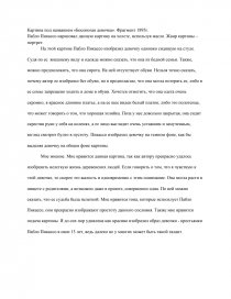 На этой картине Пабло Пикассо изобразил девочку одиноко сидящую на стуле. Судя по ее внешнему виду и одежде можно сказать, что она из бедной семьи. Также, можно предположить, что она сирота. На ней отсутствует обуви. Нельзя точно сказать, почему автор ее изобразил без обуви, но я предполагаю, что она могла потерять ее, либо в ее семье запрещено ходить в доме в обуви. Хочется отметить, что она одета очень скромно, в красное длинное платье, а на ее шее виден белый платок, либо это полотенце, что может говорить о том, что хорошая хозяйка. Поза у нее довольно закрытая, она сидит скрестив руки у себя на коленях, а ее лицо выглядит очень уставшим и замученным, взгляд смотрит будто в пустоту. Пикассо изобразил девочку на темном фоне, как бы выделяя девочку на общем фоне картины.