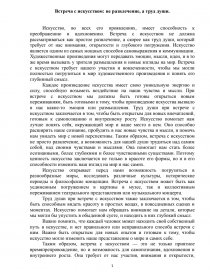Каждое произведение искусства имеет свою уникальную энергию и силу, способную возыметь воздействие на наши чувства и мысли. При встрече с искусством мы должны быть готовы открыться новым переживаниям, быть готовыми к тому, чтобы произведение искусства вызвало в нас какие-то эмоции или размышления. Труд души при встрече с искусством заключается в том, чтобы быть открытым для новых впечатлений, готовым к самопознанию и внутреннему росту. Искусство помогает нам лучше понять себя, окружающий мир и наше место в нем. Оно способно расширить наше сознание, пробудить в нас новые чувства и мысли, и помочь нам увидеть мир с новой перспективы. Таким образом, встреча с искусством не просто развлечение, а возможность для нашей души трудиться над самим собой, над своими чувствами и мыслями. Она помогает нам стать более осознанными, более глубокими и более чувственными существами. Поэтому ценность искусства заключается не только в красоте его формы, но и в его способности изменить наш взгляд на мир и нас самих.
