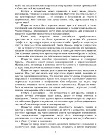 Кроме того, искусство имеет способность преобразовывать пространства и делать их более красивыми и уютными. От уличного граффити до скульптур в парках, искусство способно преобразить городскую среду и сделать ее более живописной. Таким образом, встреча с искусством — это не только эстетическое удовольствие, но и возможность для рефлексии, общения с самим собой и другими людьми, а также для творческого развития. Она позволяет нам ощутить красоту мира во всем ее многообразии и глубине, а также найти вдохновение для собственного творчества и самовыражения.
