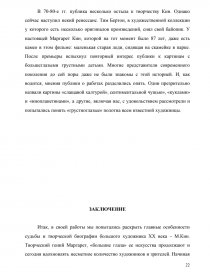 Маргарет Кин - художница, которая прославилась своими картинами детей с большими глазами. Но известна она стала сначала не как автор картин, потому что в 50-ых годах спрос на женское искусство был не велик, так что ее второй муж, Уолтер Кин, взял авторство на себя. Вот почему стилистически, работы Кин можно поделить на два этапа. Первый этап – время, когда она жила со своим мужем Уолтером и подписывала свои работы его именем. Он характеризуется темными тонами и грустными лицами изображаемых ею людей (преимущественно детей и девушек, а также нестарых женщин). После побега Маргарет на Гавайи и приобщения ее к церкви, после восстановления ею своего имени, меняется и стилистика работ художницы. Картины становятся более светлыми, лица, пусть и с большими глазами, становятся счастливыми и умиротворенными (см. Приложение №4).