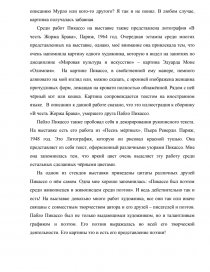 Следующая работа художника, которая привлекла моё внимание – из «Воспоминания и портреты художников», Фернан Мурло. Литография, Париж 1972 год. Передо мной на рисунке всё тем же, как мне кажется, чёрным карандашом, но уже более тонкими линиями было изображено трое. Первая – нагая женщина, из одежды на ней были только дамская шляпка, цепочка на шее и туфли. Она обращает свой взор на стоящего рядом с ней человека. Это полностью одетый мужчина. Мне он напомнил мушкетёра, так как имел при себе шпагу. Его взгляд направлен на нагую женщину, левая рука на рукояти шпаги, а правая сжимает грудь женщины. Третий персонаж на рисунке – собака. Она изображена между мужчиной и женщиной, её взгляд направлен то ли на лицо этой «дамы», то ли на её наготу. Данная работа Пикассо мне показалась комичной и откровенной, поэтому я её и выделил. Из описания к этой работе художника стало ясно, что данная его работа была иллюстрацией к книге Фернана Мурло, изданной в 1972 году. В ней описываются воспоминания о художниках, с которыми ему довелось работать. Прочитав данное описание, я ещё раз посмотрел на изображение трёх, и мне стало интересно, кого же всё–таки изобразил Пикассо? Себя по описанию Мурло или кого-то другого? Я так и не понял. В любом случае, картинка получалась забавная.