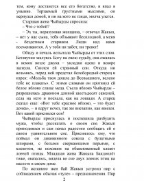 Обиду и печаль испытала Чыйырды от этих слов. Беззвучно жалуясь Богу на свою судьбу, она сжалась в комок возле джука – укладки одеял и вскоре заснула. Снился ей странный сон. Откуда ни возьмись, перед ней предстал белобородый старец и изрек: «Мольба твоя дошла до Всевышнего, велено тебе не плакать». С этими словами он протянул ей белое яблоко слаще меда. Съела яблоко Чыйырды – разрешилась драконом длиной шестьдесят саженей, села на него и поехала, как на лошади. А старец сказал еще: «Вот тебе красное яблоко, – это будет дочка», – и вдруг исчез, так же внезапно, как явился. Вот какой приснился сон!