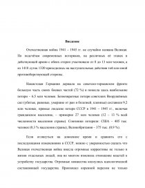 Нацистская Германия держала на советско-германском фронте большую часть своих боевых частей (72 %) и понесла здесь наибольшие потери – 6,5 млн человек. Безвозвратные потери советских Вооружённых сил (убитые, раненые, умершие от ран и болезней, пленные) составили 9,2 млн человек, прямые людские потери СССР в 1941 – 1945 гг., включая гражданское население, – примерно 27 млн человек (12 – 13 % всей численности населения страны). Союзники потеряли: США – 405 тыс. человек (0,3 % населения страны), Великобритания – 375 тыс. (0,9 %).