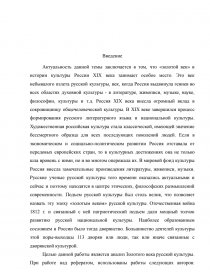 Актуальность данной темы заключается в том, что «золотой век» в истории культуры России XIX века занимает особое место. Это век небывалого взлета русской культуры, век, когда Россия выдвинула гениев во всех областях духовной культуры - в литературе, живописи, музыке, науке, философии, культуры и т.д. Россия XIX века внесла огромный вклад в сокровищницу общечеловеческой культуры. В XIX веке завершился процесс формирования русского литературного языка и национальной культуры. Художественная российская культура стала классической, имеющей значение бессмертного образца для всех последующих поколений людей. Если в экономическом и социально-политическом развитии Россия отставала от передовых европейских стран, то в культурных достижениях она не только шла вровень с ними, но и во многом опережала их. В мировой фонд культуры Россия внесла замечательные произведения литературы, живописи, музыки. Русские ученые русской культуры того времени оказались актуальными и сейчас и поэтому находятся в центре этических, философских размышлений современности. Подъем русской культуры был столь велик, что позволяет назвать эту эпоху «золотым веком» русской культуры. Отечественная война 1812 г. и связанный с ней патриотический подъем дали мощный толчок развитию русской национальной культуры. Наиболее образованным сословием в России было тогда дворянство. Большинство деятелей культуры этой поры-выходцы 113 дворян или люди, так или иначе связанные с дворянской культурой.
