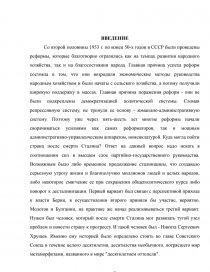 Со второй половины 1953 г. по конец 50-х годов в СССР были проведены реформы, которые благотворно отразились как на темпах развития народного хозяйства, так и на благосостоянии народа. Главная причина успеха реформ состояла в том, что они возродили экономические методы руководства народным хозяйством и были начаты с сельского хозяйства, а потому получили широкую поддержку в массах. Главная причина поражения реформ - они не были подкреплены демократизацией политической системы. Сломав репрессивную систему, не тронули ее основу - командно-административную систему. Поэтому уже через пять-шесть лет многие реформы начали сворачиваться усилиями как самих реформаторов, так и мощным административно-управленческим аппаратом, номенклатурой. Куда могла пойти страна после смерти Сталина? Ответ на данный вопрос надо искать в соотношении сил в высшем слое партийно-государственного руководства. Возможным было либо временное продолжение сталинщины, что создавало серьезную угрозу жизни и благополучию миллионов людей и целых народов, либо некоторое смягчение ее при сохранении общеполитического курса либо поворот к десталинизации. Первый вариант был связан с перспективой прихода к власти Берии, в осуществлении второго приняли бы участие, вероятно, Молотов и Булганин, на практике же начал реализовываться третий вариант. Нужен был человек, который после смерти Сталина мог развязать тугой узел проблем и повести страну к прогрессу. И такой человек был - Никита Сергеевич Хрущев. Именно ему историей было определено стоять во главе Советского Союза в течение целого десятилетия, десятилетия необычного, потрясшего мир метаморфозами, названного в мире "десятилетием оттепели".