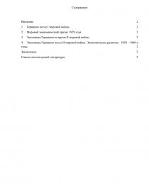 Разрушительные последствия мирового кризиса для экономики Германии были катастрофическими. Промышленное производство сократилось почти наполовину. Доля Германии в мировом промышленном производстве снизилась, экспорт Германии сократился. Лишь треть немецких рабочих имела полную рабочую неделю. В разгар кризиса немецкая промышленность была загружена только на 35,7 %. Средне недельная заработная плата немецких рабочих в 1932 г. была на 47 % меньше, чем в 1929 г. Германия превращалась в страну нищеты, безработицы, хронического недоедания, безысходности и отчаяния для миллионов людей. В XX век Германия вступила империалистической державой с высокоразвитой экономикой. По уровню промышленного производства страна выдвинулась на 1-ое место в Европе, обогнав Великобританию. Несмотря на периодические кризисы, несколько замедлявшие экономическое развитие, оно шло быстрыми темпами. Стремительный подъем тяжелой индустрии в немалой степени определялся растущими потребностями германского милитаризма. Под знаком милитаризма происходила перестройка всей экономической и политической общественной структуры Германии. На внутреннем рынке страны происходило постоянное повышение, В целом в Германии увеличилось количество монополий, картелей, огромное значение приобрели банки. В начале XX века в Германии усилился вывоз капитала. В 1902 германские инвестиции за границей составляли 12,5 миллиардов франков, а через 10 лет - 44 миллиарда. Германия наращивала вооружение, при этом расходы за 30 лет выросли в 5 раз, превысив 1600 миллионов марок, что составило более половины государственного бюджета. Цель работы: рассмотреть экономическое развитие Германии в XX веке.