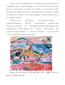В школьное время я закончила художественную школу и конечно же, картины имели отдельное место во всей моей жизни, как и картины в данном музее. Конечно же я хотела посмотреть главные экспонаты Эрмитажа, к которым относятся картины: «Мадонна Литта» Леонардо Да Винчи, «Дама в голубом» Томас Гейнсборо, «Мост Ватерлоо. Эффект тумана» Лондонский цикл Клода Моне, «Чёрный квадрат» К. С. Малевич. Но не они зажгли во мне искорку, а вовсе неприметная картина «Вид Коллиура» Анри Матисс.
