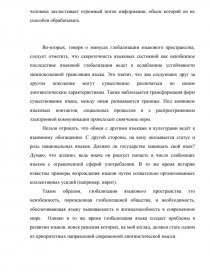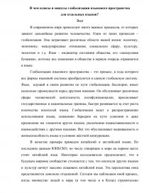 Глобализация языкового пространства – это процесс, в ходе которого все формы языковой системы преобразуются в единую глобальную систему. Язык, идущий в своём развитии по пути глобализации, бесспорно, имеет несколько преимуществ перед другими языками. Он обслуживает различные сферы человеческой деятельности, полифункционален, преодолевает государственные и национальные границы, быстро развивается за счет роста количества носителей языка. Глобализация ведет к распространению использования языка, снижению барьеров на пути усвоения и даже присвоения им элементов других языков, увеличению взаимозависимости и взаимодействия с другими языками. Всё это обусловливает выживаемость и жизнеспособность языка в условиях жёсткой конкуренции.
