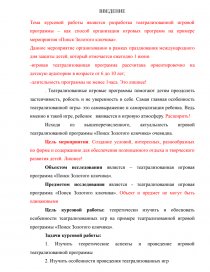 Цель курсовой работы: теоретически изучить и обосновать особенности театрализованных игр на примере театрализованной игровой программы «Поиск Золотого ключика».