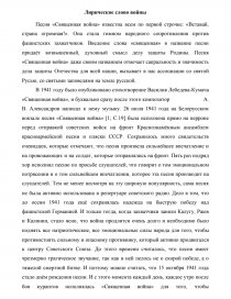 Песня «Священная война» известна всем по первой строчке: «Вставай, страна огромная!». Она стала гимном народного сопротивления против фашистских захватчиков. Введение слова «священная» в название песни придаёт возвышенный, духовный смысл делу защиты Родины. Песня «Священная война» даже своим названием отмечает сакральность и значимость дела защиты Отечества для всей нации, вызывает в нас ассоциации со святой Русью, со святыми заповедями на земле русской.