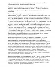 Средняя часть погребения наиболее пригодна для исследования и раскрывает весь смысл первой подсказки. Один признак погребальной традиции сам по себе не может быть основанием для каких-либо исторических предположений. Только совокупность этих признаков, найденная в достаточном количестве могил и полностью изученная, может быть основанием для того или иного исторического прогноза. Иногда особенности тщательно изученных погребений требуют дополнительных доказательств. Это связано с тем, что погребальная традиция, как совокупность различных признаков, встречающихся в разное время и на разных территориях, дает мало аналогий и вариантов. Поэтому все это следует учитывать при использовании древних захоронений в качестве исторических данных.