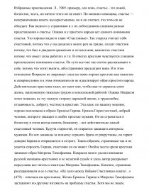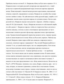 Проблема счастья в поэме Н. А. Некрасова «Кому на Руси жить хорошо». Н. А. Некрасов вошел в историю русской литературы как народный поэт, с такой резкостью и прямотой раскрывающий перед читателем картины народной жизни. Повествующий о тяжелой жизни русского крестьянина, наполненной печалью, нищетой, страданиями и слезами, Некрасов не случайно был назван поэтом «любви и гнева». Он действительно любил русский народ, скорбел о его страданиях, высоко ценил в русском народе его духовное начало. Как ни один русский поэт, Некрасов ощущал свое родство с народом. «Любовь к народу, - писал Ф. М. Достоевский, - была у Некрасова исходом его собственной скорби по себе самом»1 . Некрасов старался, чтобы его творчество было доступно и понятно каждому, и потому в своих стихотворных произведениях он часто использовал элементы русского фольклора, народные песни, просторечные слова. Художественной вершиной творчества великого поэта, главным трудом всей его жизни является его поэма «Кому на Руси жить хорошо». Работая над поэмой, Некрасов ставил перед собой цель написать «народную книгу», полезную, понятную народу и правдивую2 . Над поэмой Некрасов работал в течение 15 лет, до самой своей смерти, так и не завершив работу. Хотя поэма так и не была окончена, многие литературные критики отмечали ее поразительную целостность3 . Главная проблема поэмы — это проблема счастья. Это отчасти видно уже по самому названию поэмы. В самом начале поэмы нашему вниманию предстают семь странников, семь простых мужиков, путешествующих по стране и пытающихся найти счастливого человека. У каждого из них свои представления о том: «Кому живется весело, Вольготно на Руси?». (297)4 Помещик, чиновник, поп, купец, боярин, министр, царь – вот те лица, которые, по мнению странников, должны быть счастливыми. Однако, когда автор сталкивает своих героев с такими «счастливцами», никто из них не считает себя счастливым. К 1 Якушин В. И. Некрасов в школе. М., 2004. С. 8. 2 Твердохлебов И.Ю. Поэма Некрасова «Кому на Руси жить хорошо». М., 1954. С. 15. 3 Скатов Н. «Муза гнева и печали».// Н. А. Некрасов Избранные произведения. Л., 1969. С. 20. 4 Ссылки даны по изданию: Некрасов Н. А. Избранные произведения. Л., 1969. примеру, для попа, счастье - это покой, богатство, честь, но ничего этого он не имеет. По мнению помещика, счастье — неограниченная власть над крестьянами, но и он считает, что этим он не обладает. Как видим и у странников и у их собеседников слишком разные представления о счастье. Однако и у простого народа нет единого понимания счастья. Это хорошо видно в главе «Счастливые». Так старуха считает себя счастливой, потому что у нее родилось много реп на грядке, солдат счастлив потому, что был в двадцати сраженьях и остался жив, каменотес счастлив потому, что имеет силы работать и т.п. В ответах крестьян чувствуется слишком приземленное понимание счастья. По сути все они так охотно рассказывают о себе, потому что хотят выпить, ибо странники предлагают вина. И в этом отношении Некрасов не закрывает глаза на такие пороки крестьян как пьянство и сквернословие и в этом отношении он не идеализирует образ простого народа. Действительно крестьяне пьют, но пьют они, чтобы как-то скрасить свою жизнь, наполненную тяжелым трудом и непосильной работой. Однако Некрасов хочет показать не эту темную сторону народной жизни, а трудолюбие, 