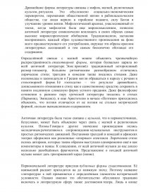 Древнейшие формы литературы связаны с мифом, магией, религиозным культом, ритуалом. Это обусловлено социально-экономическим переворотом, переменами общественной жизни в рабовладельческом обществе, где люди верили в геройские подвиги, силу Богов и улучшение уровня жизни. Мифологический арсенал, унаследованный от эпохи, когда мифология была еще мироосмыслением, позволил античной литературе символически воплощать в своих образах самые высокие мировоззренческие обобщения. Традиционализм, заставляя воспринимать каждый образ художественного произведения на фоне всего предшествующего его употребления, окружал эти образы ореолом литературных ассоциаций и тем самым бесконечно обогащал его содержание.