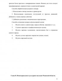 В каждом регионе нашей страны в настоящий момент немаловажным в работе с любительским творческим коллективом, является сохранение, восстановление и популяризация хореографических композиций на основе фольклора. Одним из наиболее распространенных и древних видов народного творчества является русский фольклорный танец. За свою многовековую историю фольклорный танец всегда был тесно связан с трудовыми и календарными событиями. Русский фольклорный танец неразрывно связан народным бытом, обычаями, обрядами, и играми. В хореографии народ рассказывает свое мышление, эмоции, настроение, отношение к окружающим его событиям. В наибольшей степени мировые портреты фольклорных хореографических композиций созданы мастерами народной хореографии: Надеждой Надеждиной, Игорем Моисеевым, основываясь на традициях народов, изучении их самобытности, все это они показали в хореографии. Наибольшей задачей, на которую обязан ответить хореограф, занимающийся разбором фольклорного материала, - это вопрос, каким должна быть суть его хореографической работы, ввиду того, что образ композиции определен смыслом. Каждый танец находящийся в определенной местности, будь то поселок, область или город содержит свои собственные черты исполнения, в то же время сохраняя общенациональные качества. Сохранением истоков самобытности народа занимается областной научно-методический центр, который, как правило, располагается в областных и краевых центрах. ОНМЦ проводит работу по сбору и сохранению народного творчества. Хореографы, занимающиеся любительскими творческими коллективами обязаны сопровождать данный процесс, разрабатывая запись и систематизацию своих постановок. Погружаясь в изучение народного танцевального искусства, постановщик обязан использовать данные сведения в своей работе, при этом избегая подражания. Не просто механически перенося на сцену чужой материал, а украшать и расширять своим балетмейстерским воображением. Отталкиваясь от первоисточника реализовывать сценически правильные хореографические композиции, обязан знать и изучать обычаи и обряды своей местности, своего района и области. Имея в своем репертуаре фольклорные хореографические композиции, коллектив сохраняет народную культуру, самобытность своего района, области, формируя положительное отношение своего коллектива к истории и самобытности своего края. Формирование данного репертуара поднимает культурную и учебно-тренировочную деятельность коллектива, определяет его основную и творческую жизнь. За основу курсовой работы была выбрана Рязанская область. Этот регион является наиболее ярким примером в сохранении своего нематериального культурного наследия.