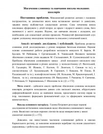 Аналіз останніх досліджень і публікацій. Проблема розвитку словника дітей досліджувалась у різних напрямах багатьма вченими. Наукові основи словникової роботи розробляли методисти минулого К. Бархін, Ф. Буслаєв, М. Рибнікова, І. Срєзнєвський, К. Ушинський. Великого значення збагачення словник учнів надавали М. Стельмахович, В. Сухомлинський та ін. Проблема збагачення словникового запасу дітей молодшого шкільного віку розглядалася науковцями в різних аспектах: у психологічному (Л. Виготський, П. Гальперін, М. Жинкін, Г. Костюк, О. Леонтьєв, І. Синиця та ін.), в лінгвістичному (Л. Булаховський, В. Горпинич, І. Ковалик, М. Плюш, В. Русанівський та ін.), психофізіологічному (М. Кольцова, М. Красногорський, І. Павлов, та ін.), лінгводидактичному (М. Вашуленко, Т. Рамзаєва, О. Савченко, Т. Потоцька, О. Хорошковська, Г. Шелехова та ін.) [2, c.172].