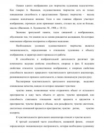 Очевидно, замысел и выполнение произведения изобразительного искусства невозможны без развитого воображения. Работа воображения при этом проявляется: а) в комбинировании (сочетании имеющихся представлений в новые комбинации), б) в акцентировании (подчеркивании в образе определенных черт, заострении и т. д.), в) в типизации.