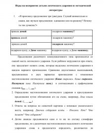 - Детям дважды предъявляется одно и то же по составу словоформ предложение, но с различным местоположением выделенного логическим ударением слова и предлагается определить, различаются ли предложения по звучанию и в чем состоит это различие (Кате купили туфли, а Оле платье. Кате купили туфли, а Оле платье.)