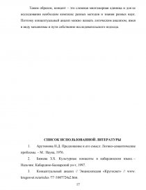 ВВЕДЕНИЕ……………………………………………………………………. ГЛАВА 1. ПОНИМАНИЕ КОНЦЕПТОВ И ИХ ТИПЫ В СОВРЕМЕННОЙ ЛИНГВИСТИКЕ…………………………………………. 1.1. Понимание концептов в современной лингвистике…………………. 1.2. Типы концептов………………………………………………………….. ГЛАВА 2. КОНЦЕПТУАЛЬНЫЙ АНАЛИЗ КАК АНАЛИЗ НАУЧНОГО ТЕКСТА В РАКУРСЕ ОПРЕДЕЛЕННОЙ КОНЦЕПЦИИ ИЛИ ТЕОРИИ.. 2.1. Описание концептуального анализа с точки зрения различных авторов…………………………………………………………………………. 2.2. Цели и методы проведения концептуального анализа………………… ЗАКЛЮЧЕНИЕ……………………………………………………………...... СПИСОК ИСПОЛЬЗОВАНОЙ ЛИТЕРАТУРЫ…………………………..... | 3 5 5 6 9 9 13 15 17 |