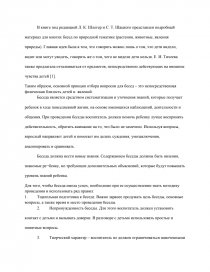 В книге под редакцией Л. К. Шлегер и С. Т. Шацкого представлен подробный материал для многих бесед по природной тематике (растения, животные, явления природы). Главная идея была в том, что говорить можно лишь о том, что дети видели, видят или могут увидеть, говорить же о том, чего не видели дети нельзя. Е. И. Тихеева также предлагала отталкиваться от предметов, непосредственно действующих на внешние чувства детей [1].