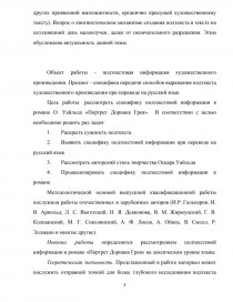 Цель работы: рассмотреть специфику подтекстовой информации в романе О. Уайльда «Портрет Дориана Грея». В соответствии с целью необходимо решить ряд задач: