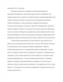 Концепция не претендует на выработку механизмов организационно управленческой и финансово экономической сфер дошкольного образования. Она направлена прежде всего на развитие и совершенствование содержания образования детей старшего дошкольного возраста и на обеспечение его програмнометодическими и учебными материалами, а также на реализацию в образовательном процессе методологических принципов, изложенных в Законе РФ «Об образовании». Концепция отражает потребность общества и государства в качественном дошкольном образовании, которое,