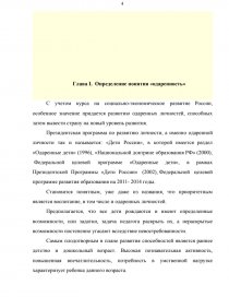 В первой главе раскрывается понятие «одаренность», «одаренный ребенок». Во второй главе изучаются виды одаренности по «Рабочей концепции одаренности»;