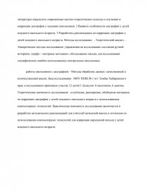 Оглавление Введение Глава 1.Основы проблемы коррекции дисграфии у детей младшего школьного возраста. 1.1 Дисграфия как специальное нарушение письма 1.2 Особенности проявления дисграфии у младших школьников 1.3 Организация логопедической работы по преодолению дисграфии у детей школьного возраста 1.4 Использование компьютерных технологий в коррекции дисграфии Глава 2. Эмпирическое исследование дисграфии у детей младшего школьного возраста 2.1 Методы и организация исследования 2.2 Выявление уровня сформированности навыка письма у младших школьников 2.3 Составление методических рекомендаций для педагогов и родителей по коррекции дисграфии у младших школьников путем компьютерных технологий Заключение Библиографический список Приложения Введение В настоящее время появилось большое количество школьников, которые с трудом осваивают родной язык как учебный предмет. По данным разных авторов, в России дисграфия выявляется у 10% - 25% учеников начальных класс. Родители жалуются на невнимательность детей, неусидчивость, нежелание учиться, негуманитарный склад ума и т.п. В ряде случаев родители правы, но подчас за