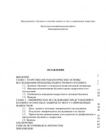ОГЛАВЛЕНИЕ[a] ВВЕДЕНИЕГЛАВА I. ТЕОРЕТИКО-МЕТОДОЛОГИЧЕСКИЕ ОСНОВЫ ИССЛЕДОВАНИЯ ПРОБЛЕМЫ ПОДРОСТКОВОГО БУЛЛИНГА1.1. Понятие «буллинг» в психолого-педагогической литературе1.2. Факторы возникновения буллинга среди подростков и его последствия1.3. Особенности поведения подростков в ситуации буллинга1.4. ВыводыГЛАВА 2. ЭМПИРИЧЕСКОЕ ИССЛЕДОВАНИЕ ПРЕДСТАВЛЕНИЙ О БУЛЛИНГЕ И СПОСОБАХ ЗАЩИТЫ ОТ НЕГО У СОВРЕМЕННЫХ ПОДРОСТКОВ2.1. Цель, задачи и методика эмпирического исследования2.2. Результаты эмпирического исследования и их анализ2.3. Практические рекомендации для педагогов по профилактике и преодолению буллинга у подростков2.4. ВыводыЗАКЛЮЧЕНИЕСПИСОК ИСТОЧНИКОВ И ЛИТЕРАТУРЫПРИЛОЖЕНИЕ | 3771728353838465559616467 |