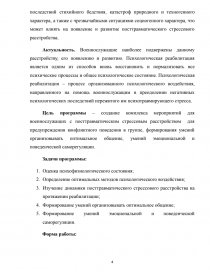 Цель программы – создание комплекса мероприятий для военнослужащих с посттравматическим стрессовым расстройством для предупреждения конфликтного поведения в группе, формирования умений организовывать оптимальное общение, умений эмоциональной и поведенческой саморегуляции.