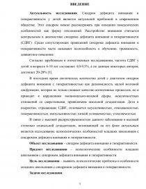 Актуальность исследования. Синдром дефицита внимания и гиперактивности у детей является актуальной проблемой в современном обществе. Этот синдром можно рассматривать при описании поведенческих особенностей как форму отклонений. Расстройство внимания считается центральным в диагностике синдрома дефицита внимания и гиперактивности (СДВГ). Среди сопутствующих проявлений синдрома дефицита внимания и гиперактивности часто называют неспособность к обучению, тревожность, девиантное поведение.