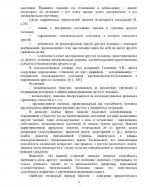 В дипломной работе мы исходим из определения, что эмпатия - личностное свойство, которое имеет социальную природу и как любое социально обусловленное свойство поддается целенаправленному формированию. А так же понятия, предложенного Юсуповым И.М., согласно которому эмпатия - целостный феномен, связующий между собой сознательную и подсознательную инстанции психики, цель которого – «проникновение» во внутренний мир другого человека или антропоморфизированного объекта [3]. Феномен эмпатии имеет социально - психологическое происхождение и многоуровневую структуру с психофизиологическими, психологическими и социально-психологическими уровнями и предстает в ипостасях процесса, свойства и состояния. Одним из составляющих процессов эмпатии является эмпатийное понимание, имеющее свою специфику. Эмпатийное понимание в психологии рассматривается как продукт социализации личности и формируется во взаимодействии аффективных, когнитивных и действенных компонентов [3, С. 148-149].