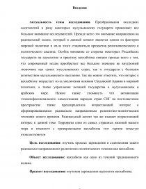 Актуальность темы исследования. Преобразования последних десятилетий в ряду некоторых мусульманских государств привлекает все большое внимание исследователей. Прежде всего это внимание направленно на радикальный ислам, который в данный момент является одним из факторов мировой политики и из-за этого становиться предметов религиоведческого и политического анализа. Особое внимание со стороны некоторых Российских государств на идеологию и практику ваххабизма связано прежде всего с тем, что современный ислам приобретает все большое значение во внутренней экономике как самих мусульманских стран, так и государств с большим количеством мусульманского населения. Так же можно отметить, что интерес к ваххабизму возрастает из-за увеличения влияния Саудовской Аравии в мировой политики, а также укрепления позиций государства в мусульманском и арабском мире. Нужно также упомянуть что активизация этноконфессионального самосознания народов стран СНГ на постсоветском пространстве также предопределила возрастающий интерес к сформировавшимися радикально направленным религиозно-политическим течениям нового времени. Радикальный аспект так же взывает возрастающий интерес к данной теме. Терроризм одно из самых страшных явлений нашего мира и именного с приверженцами ваххабизма этот термин зачастую отождествляется.