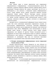 Базы данных лежат в основе практически всех современных информационных и информационно - телекоммуникационных систем. Их появление и развитие коренным образом изменило характер работы многих организаций. История развития баз данных насчитывает уже 60 лет, а необходимость в них возникла с появлением первых информационных систем. Самой важной частью данной технологии являются системы управления базами данных. Именно благодаря данным системам обеспечивается быстрый и удобный доступ к данным. Также благодаря тому, что данные системы привносят новые математические модели в свою структуру, появляется возможность хранить логически не ограниченное количество данных.