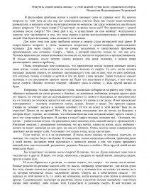 Очень интересным мне показалось, что практически всегда человек начинает ценить свою жизнь, только когда остается на последнем волоске от смерти. То есть, когда человек ощущает дыхание смерти, он начинает задумываться о том, как он жил, чего он смог добиться, что осталось только в планах и мечтах и что же будет с ним дальше. Также только от самого человека и его восприятия зависит каким же будет его настоящее и будущее, в том числе и после смерти. Именно поэтому говорят: «Живите здесь и сейчас...», ведь другой жизни не будет.