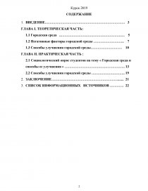 ГЛАВА I. ТЕОРЕТИЧЕСКАЯ ЧАСТЬ: 1.1 Городская среда ..………………………………………………. 5 1.2 Негативные факторы городской среды ……………………... 7 1.3 Способы улучшения городской среды……………………… 10 ГЛАВА II. ПРАКТИЧЕСКАЯ ЧАСТЬ : 2.1 Социологический опрос студентов на тему « Городская среда и способы ее улучшения » ……………………………………………. 13 2.2 Способы улучшения городской среды ……………………….. 19