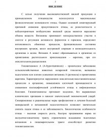 С целью получения высококачественной мясной продукции в промышленном птицеводстве используются максимальные физиологические возможности птицы. Однако основной лимитирующей причиной снижения продуктивности птицы, ее резистентности к неблагоприятным возбудителям внешней среды является нарушение обмена веществ. Витамины принимают непосредственное участие в синтезе и регуляции активности ферментов и гормонов, определяют интенсивность обменных процессов, функциональное состояние внутренних органов, желез внутренней секреции и жизнедеятельность организма в целом. Витамин А может образовываться в организме из провитамина растительного происхождения – каротина, при его окислительном расщеплении.