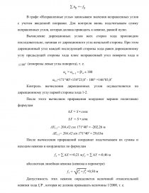 Вычислительные работы начинаем с уравнивания измеренных углов. Для этого под графой «измеренные углы» проводим черту и подсчитываем сумму всех измеренных углов без примычного и вычисляем угловую невязку по формуле