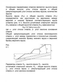 Основными параметрами отвалов являются: высота яруса и общая высота, углы откоса ярусов и общий (результирующий) угол откоса системы ярусов, количество ярусов.