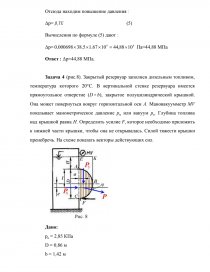 Задача 4 (рис.8). Закрытый резервуар заполнен дизельным топливом, температура которого 20°С. В вертикальной стенке резервуара имеется прямоугольное отверстие (D × b), закрытое полуцилиндрической крышкой. Она может повернуться вокруг горизонтальной оси А. Мановакуумметр МV показывает манометрическое давление рм или вакуум рв. Глубина топлива над крышкой равна Н. Определить усилие F, которое необходимо приложить к нижней части крышки, чтобы она не открывалась. Силой тяжести крышки пренебречь. На схеме показать векторы действующих сил.