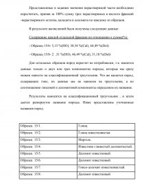 Представленные в задании значения нерастворимой части необходимо пересчитать, приняв за 100% сумму трех нерастворимых в кислоте фракций -нерастворимого остатка, кальцита и доломита по каждому из образцов.