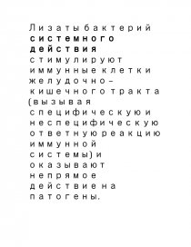Лизаты бактерий рассматривают как иммуностимуляторы бактериального происхождения. Они бывают двух видов: топические и системного действия. Лизаты бактерий топического действия (спреи и таблетки для рассасывания) имеют недостатки, так как достаточно быстро удаляются ресничками эпителия или смываются слюной, не успевая в полной мере взаимодействовать с антителами. Лизаты бактерий системного действия стимулируют иммунные клетки желудочно – кишечного тракта (вызывая специфическую и неспецифическую ответную реакцию иммунной системы) и оказывают непрямое действие на патогены.